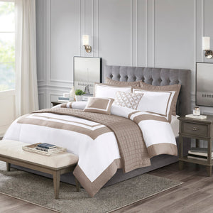- Quilt and matching shams have end-to-end diamond quilting; and throw pillows have embroidered and pieced details