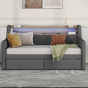 Twin Size Daybed with Storage Drawers, Upholstered Daybed with Charging Station and LED Lights, Gray(Old Item W1580S00023)