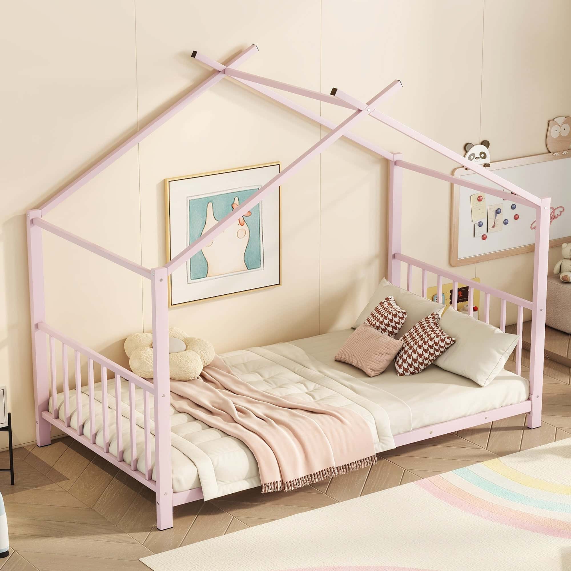Twin Size Metal House Bed with Twin Size Trundle, Black