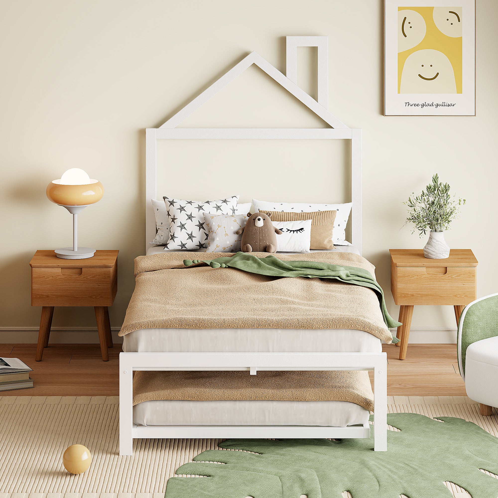 Twin Size Metal Platform Bed with two drawers,House-Shaped Headboard Design, White