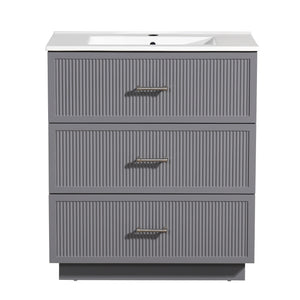 - Modern Bathroom Vanity : Our bathroom sink vanity features a smooth ceramics basin and two drawers, with sleek metal handles and fashionable stripe design. The overall dimensions of this freestanding bathroom sink cabinet 29.75"L x 18.25" W x 34.13"H. (Faucet and pop-up device not included.)