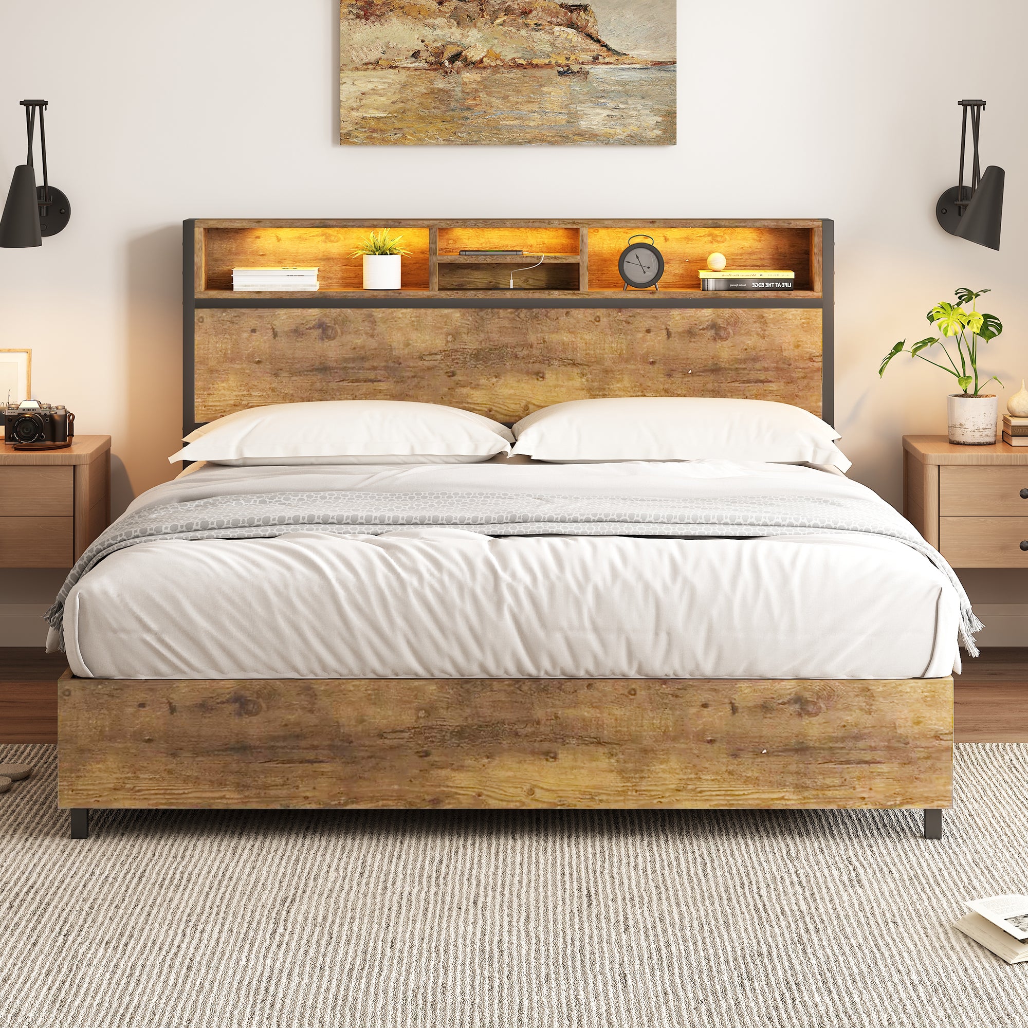Queen Size Wood Storage Platform Bed with LED Light, Rattan Headboard, Nature