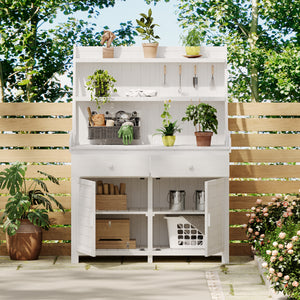 - [Organized Storage] The three-tier shelves is perfect to showcase your favorite plantings, flowers or place some tools on it. The table comes with two spacious drawers, one cabinet with double shelves, as it provides ample storage space to separate different types of items into specific compartments, keeping everything well-organized and within reach.