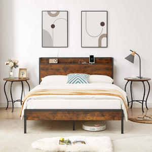 Bed frame with charging station full size, Rustic Brown, 83.1'' L x 56.1'' W x 39'' H
