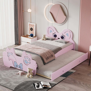 Cartoon Twin Size Platform Bed with Trundle, Pink