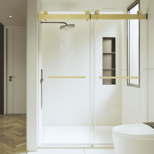 Transform your bathroom with this sleek Frameless Double Sliding Soft-Close Shower Door in a stunning brushed gold finish. Sized at 56-60"W x 76"H, the 3/8" (10mm) thick SGCC tempered glass provides durability and a pristine, clear view. The soft-close mechanism ensures smooth and quiet operation, while the high-quality stainless steel hardware adds to the door’s premium feel. This elegant shower door offers a seamless, modern look that enhances any bathroom décor with style, ease of use, and lasting quality. Perfect for creating a spa-inspired retreat in your home.