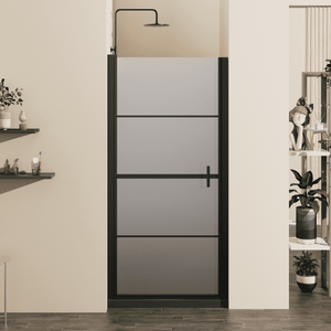 - Material: 1/5" thick tempered glass, frosted with black grid pattern, hinged hardwares are made of matte black printed aluminum alloy, pivot heads and handle are made of zinc alloy.