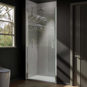 Elevate your bathroom with this elegant 36-38” wide by 72” high semi-frameless pivot shower door, crafted from clear tempered glass and finished in polished chrome. The pivot design ensures smooth operation and easy access, while the semi-frameless style adds a touch of modern sophistication. Perfect for contemporary bathrooms, this shower door combines durability, functionality, and timeless style, creating an inviting and spacious feel in your shower area.