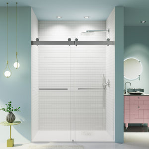 - DOUBLE SLIIDNG WITH SOFT-CLOSE: This semi-frameless shower door can be adjusted to 56 and 60 in width by cutting, maximize your bathroom layout of our double sliding door system, designed for easy access while using minimal space for smooth, unobstructed movement. The door body is light and flexible, with a long mechanical life, and provides smooth opening and closing.