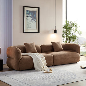 - Camel color, two-part sectional sofa, durable fabric, solid wood frame, high density sponge filling, creative inspiration from toast, with 2 throw pillows.