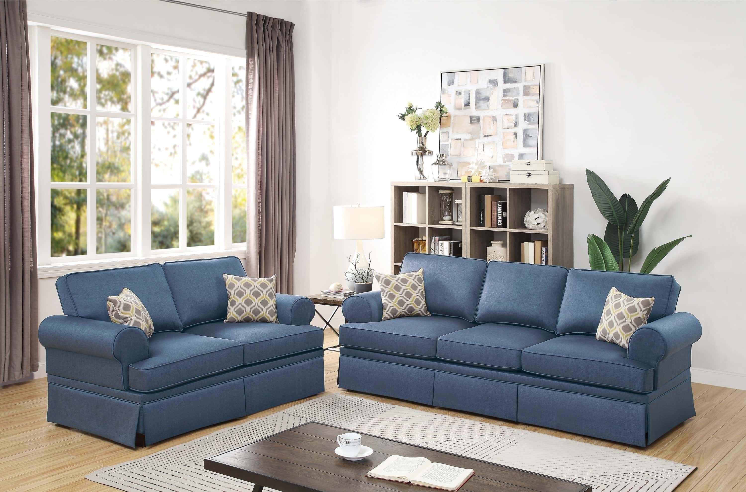 2pc Sofa Set Sofa And Loveseat Living Room Furniture Blue Glossy Polyfiber Cushion Couch