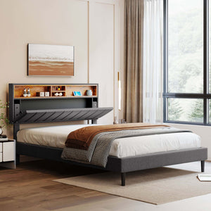 - [Versatility]this upholstered bed features a book shelf at the headboard and USB charging ports. Two mobile phone storage pockets on either side of the headboard,In addition, the headboard can be opened to hide a huge storage space inside.this bed meets your various needs