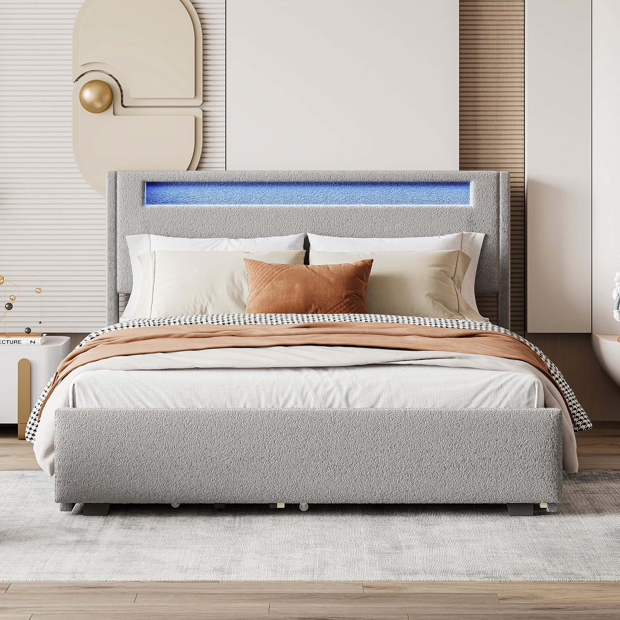 Queen Size Upholstered Platform Bed with LED Frame and 4 Drawers, Linen Fabric, Gray