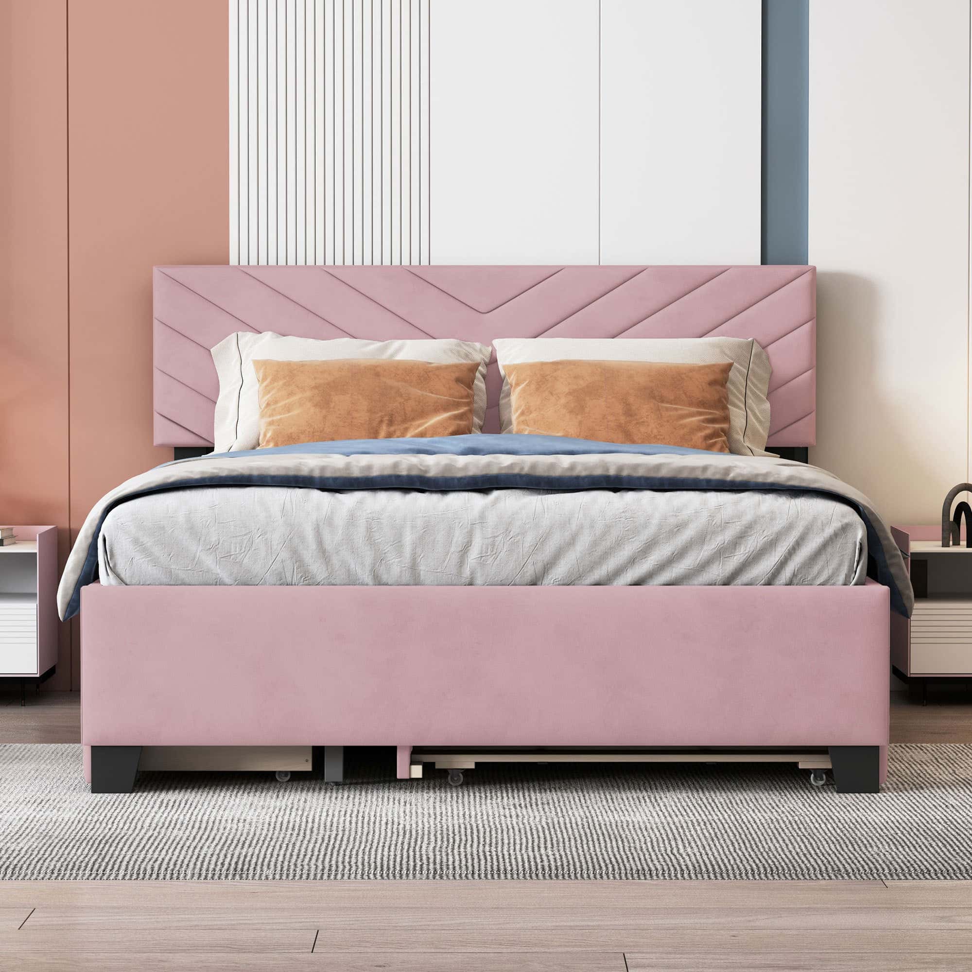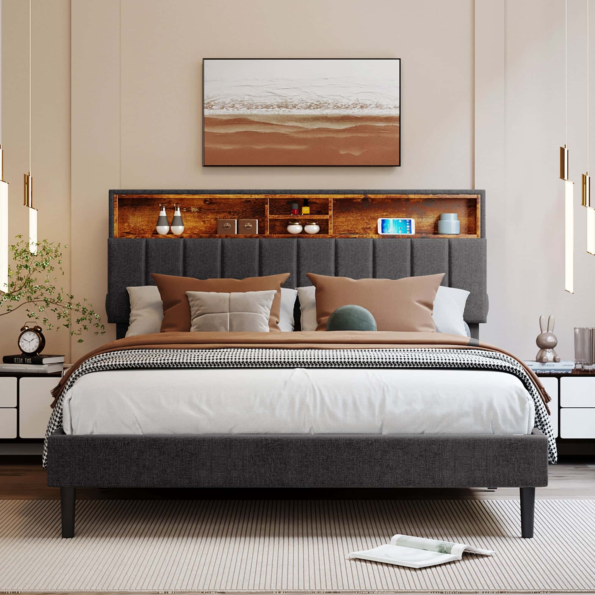 Queen Size Upholstered Platform Bed with Thick Fabric, Polyester, Beige