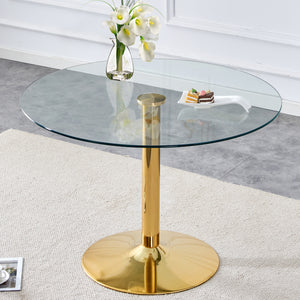 A 39.7-inch diameter glass top and a modern, minimalist round dining table with gold metal legs. Ideal for dining rooms, living rooms and meeting rooms. Model: DT-1166