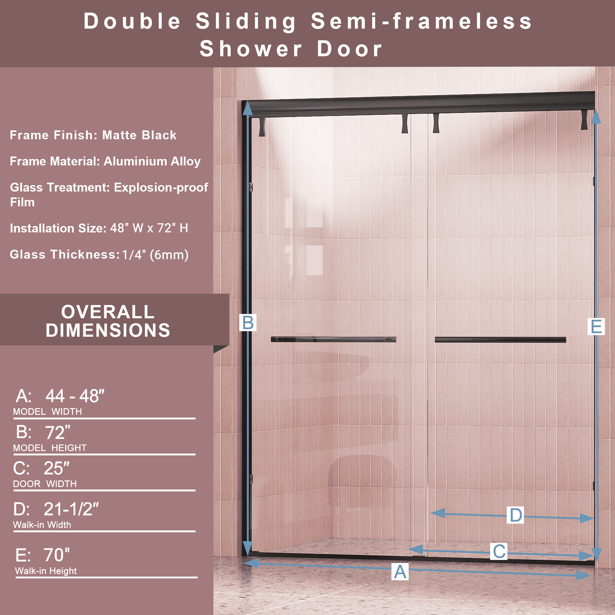 (44 - 48"W x 72"H), (56 - 60"W x 72"H) Semi-Frameless Shower Door, Double Sliding Shower Door, 1/4" (6mm) Clear Tempered Glass Shower Door with Explosion-Proof Film, Chrome