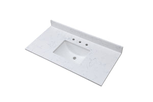 The vanity tops are made of beautiful Engineered stone. All exterior sides are polished for a luxurious look. Each model is complemented with a ceramic Rectangle undermount sink. The matching backsplash is included in each package. Product incude : Stone vanity top + backsplash+ceramic sink [DIMENSIONS] Exterior Dimension 43 inch wide x 22 inch,deep Fits Most Standard 42-in W x 21-in D vanity cabinet 4 inches center faucet holes [Material] Enginnered tone Stone top Size:43X22x3/4 inch [Elegant & Stylish Top] Warmly elegant and stylish Carrara marble vanity top complement most Bathroom designs and coordinate with both light and dark cabinetry High-end and classic natural stone top Pre-sealed and Polished for added protection [Easy to Installation] Top pre-drilled for 8-inch widespread faucet Assembled stylish rectangular white vitreous china under mount bowl with safety overflow hole This top is perfect for quick and easy remodels Obtain the beauty and durability of marble without hiring a professional [PACKAGE INCLUDED] Vanity top with assembled rectangular under mount bowl matching 4inch high Backsplash Besides extremely solid package - very firm carton box with foam is used to transport top making sure a safe delivery (Attention) Faucet and side splash NOT included