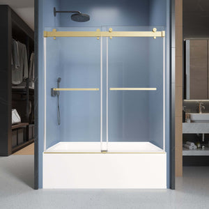 - Clear Tempered Safety Glass: The double sliding framless tub doors are made of 3/8-inch (10 mm) thick tempered glass with ANSI Z79.1 certified and SGCC certified for high impact resistance and high thermal stability to ensure durability and safety.