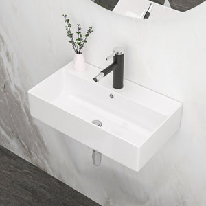 21x12 Inch White Ceramic Rectangle Wall Mount Bathroom Sink with Single Faucet Hole and Overflow