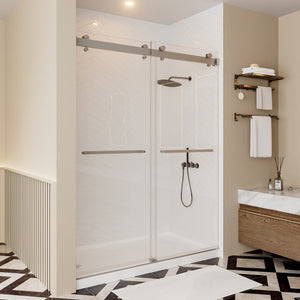 • Safety Tempered Glass: The double sliding shower door is made of 3/8 inch (10 mm) thick tempered glass with ANSI Z79.1 certified and SGCC certified for high impact resistance and high thermal stability to ensure durability and safety.